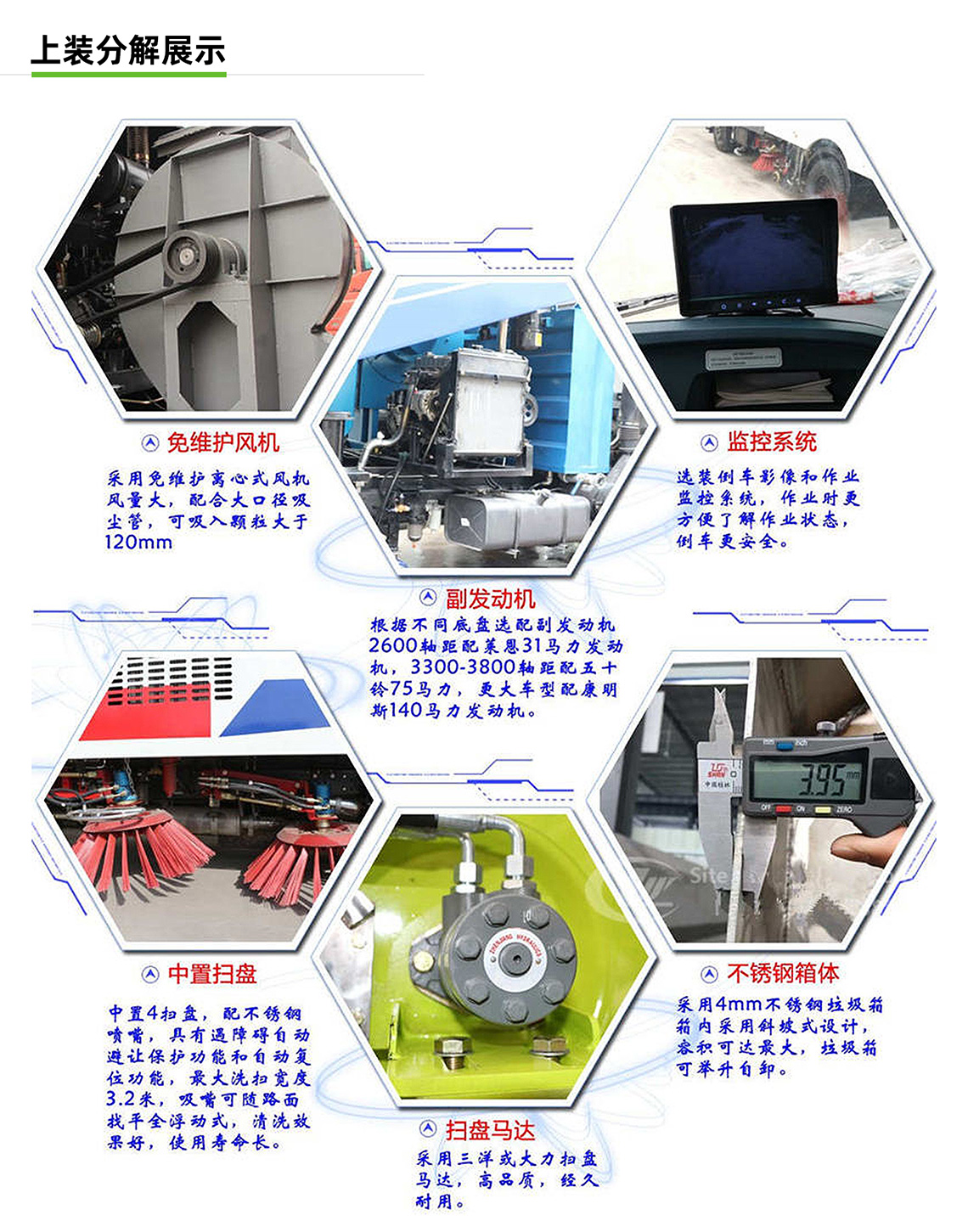 帶掃盤4把,江鈴副發動機;大力馬達;施耐德控件開關;臺灣電磁閥組;免維護自分離式離合器;免維護風機;不銹鋼水箱;不銹鋼垃圾箱;尾部LED箭頭燈;手動泵應急系統;刷臂轉動機構使用高新耐磨工程隔套,免打黃油;精密冷彎無縫液壓油管。