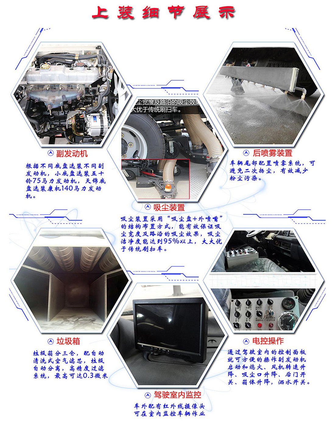 東風(fēng)多利卡7.5方吸塵車專用配置:塵箱:6立方米,水箱:2立方米;中置吸盤、江鈴五十鈴副發(fā)動機、施耐德控制開關(guān)、海普瑞斯電磁閥組、無級變速自動離合器、免維護離心式風(fēng)機、高精度垃圾箱過濾系統(tǒng)(最高可達0.5微米),不銹鋼垃圾箱、進口脈沖閥、垃圾箱舉升自卸、尾部LED箭頭燈、車尾霧狀噴水潤濕功能、倒車影像、手動泵應(yīng)急系統(tǒng)。