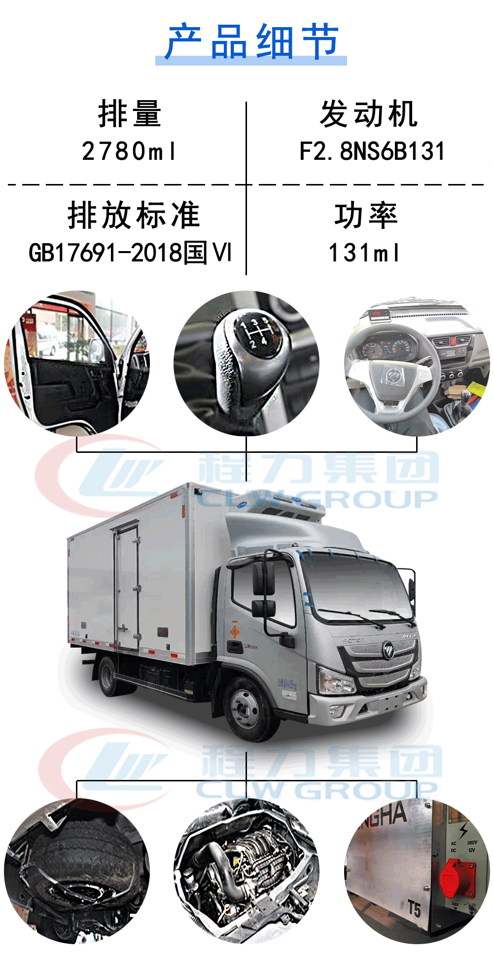 整車尺寸:5995*2340*3220 箱體尺寸:4080*2100*2100     功率/馬力:96KW/131馬力2780排量  福田康明斯發動機(F2.8NS6B131)    7.00R16LT輪胎